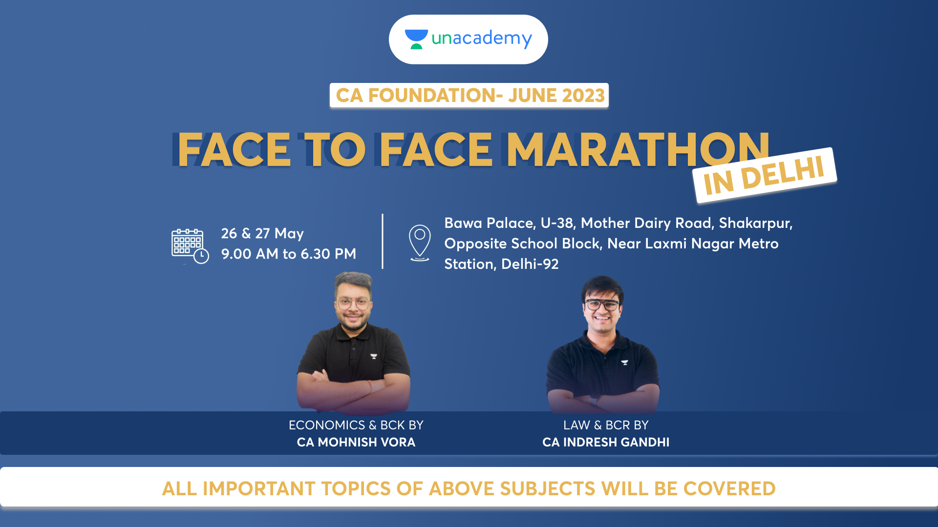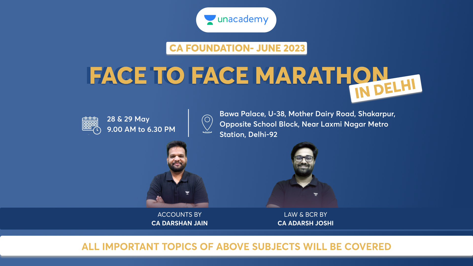 Join Unacademy for a Face to Face Marathon In Delhi with your favourites – CA Mohnish Vora, CA Indresh Gandhi, CA Darshan Jain & CA Adarsh Joshi.