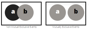 Several times it becomes important to know whether the events are mutually exclusive or not. Two or more events are said to be mutually exclusive events if they cannot occur at the same time. If a and b are two mutually exclusive events then they will not be sharing any outcomes i.e., P (a and b) = 0. Knowing the type of events influences the calculation of the probability of one or the other occurring. If two events are mutually exclusive then, the probability of either occurring is the sum of each occurring.