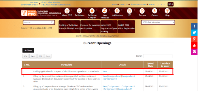 Apply online for the ITPO Recruitment 2022 at indiatradefair.com. On the recruiting website of indiatradefair.com, candidates can review the most recent ITPO Recruitment 2022 Hindi Translator Vacancy 2022 data and submit their online applications. Candidates may apply through the ITPO official website, indiatradefair.com, by using the online application form and online process provided here for the ITPO Recruitment 2022.