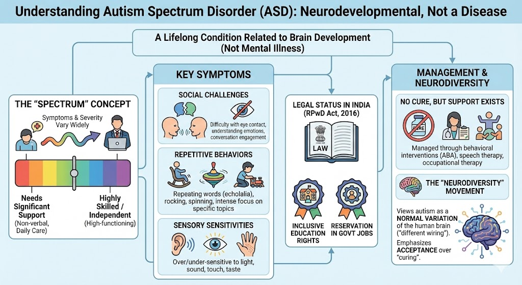 - Legal Status in India: Autism is recognized as a specific disability under the Rights of Persons with Disabilities (RPwD) Act, 2016. This grants individuals rights to inclusive education and reservation in government jobs.