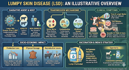 - Vaccination & India’s Strategy: Lumpi-ProVacInd: India’s first indigenous, homologous, live-attenuated vaccine developed by ICAR. It is considered superior to the previously used heterologous goat-pox vaccine.