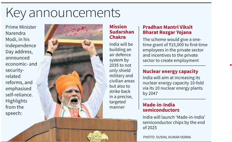 - Prime Minister Narendra Modi, in his Independence Day 2025 speech, made a strong pitch for Aatmanirbharta (self-reliance) in economic, defence, and demographic security reforms.