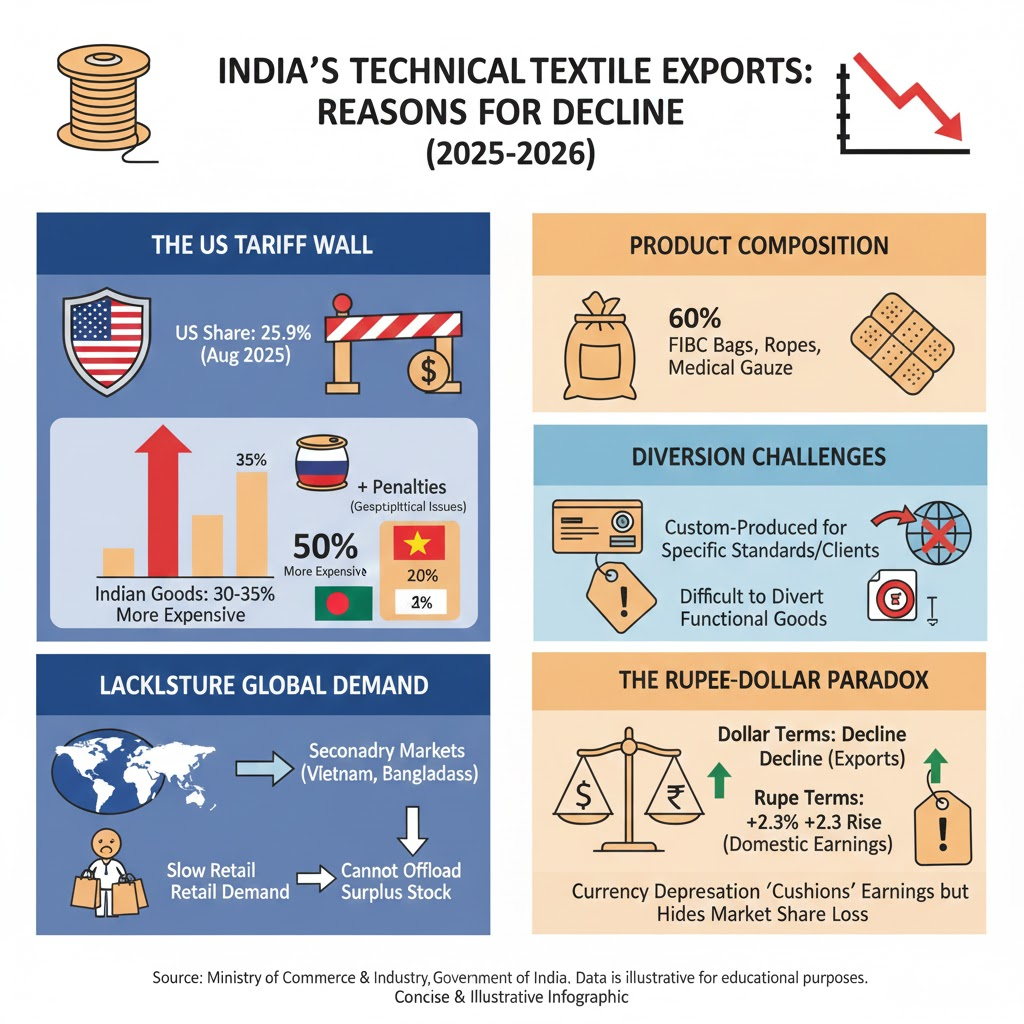 - India’s technical textile exports dipped by 1.2% (April–October 2025) reaching $1.95 billion, primarily due to steep reciprocal and penalty tariffs imposed by the United States.